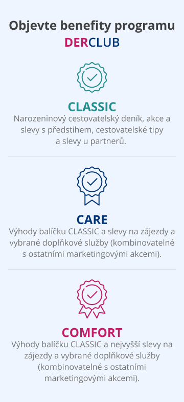 Cestování je o zážitcích – a my chceme, aby každá vaše dovolená byla výjimečná. Proto jsme vytvořili věrnostní program DERCLUB, který přináší extra výhody a péči navíc.